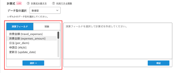 リストから計算式に含めたい項目を選択し「選択→」ボタンをクリックします。